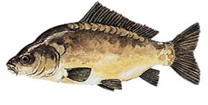 Karpfen (Cyprinus carpio) grob unterscheiden wir - neben anderen Zuchtformen - Schuppenkarpfen (Körper vollständig mit Schuppen besetzt), Spiegelkarpfen (Schuppenreihe auf dem Rücken, Schuppen vereinzelt auf dem Schwanzstiel und an den Flossenansätzen sowie den Flanken) und Lederkarpfen (ganz ohne Schuppen). Der Wildkarpfen gilt als der Stammvater der genannten Zuchtkarpfenarten. Der erste Strahl der verhältnismäßig großen Rückenflosse ist wie der erste Strahl der Afterflosse ein Sägestrahl. Die Körperform dieses behäbig wirkenden Friedfisches ist je nach Lebensraum stark hochrückig und gedrungen in Fließgewässern bis fast spindelförmig in stehenden Gewässern. Vier Barteln an seinem dicklippigen, ausstülpbarem Maul sind sein besonderes Kennzeichen. Als Bodenfisch ernährt er sich von dort vorkommenden Kleintieren und Pflanzen, selten kleinen Fischen, geht aber in warmen Jahreszeiten gern zur Nahrungsaufnahme an die Oberfläche. Zeigt der Rücken braungrüne bis blaugrüne Töne, so sind die Seiten meist gelb- bis bronzefarbig. Die Laichzeit der Karpfen setzt Wassertemperaturen von +20°C und mehr bei möglichst gutem Pflanzenwuchs voraus. Beste Fangzeiten für den Fang mit der Angel liegen von Juli bis September. |